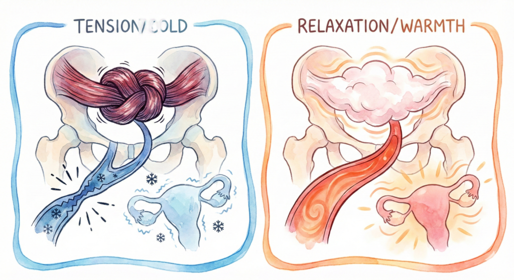 子宮や卵巣に温かい血液(栄養)を運ぶ「子宮動脈」は、骨盤の奥深くにある「腸腰筋(ちょうようきん)」という太い筋肉のすぐそばを通っています。デスクワークやストレスでこの筋肉がガチガチに緊張すると、物理的に血管を圧迫し、血流をせき止める「結び目」になってしまいます。