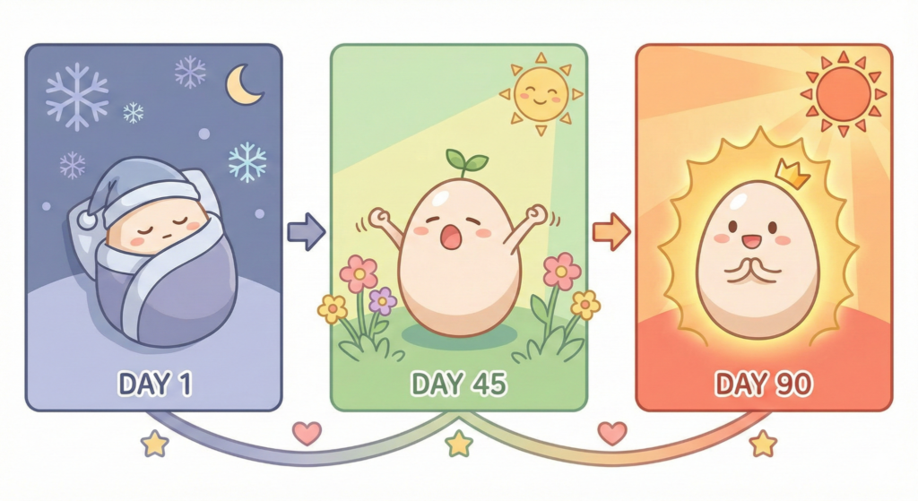 今、排卵されようとしている卵子は、実は3ヶ月以上前から卵巣の中で眠っていた「原始卵胞」が目覚め、長い時間をかけて育ったものです。つまり、今日からの身体づくり(血流改善・温活)の結果が出るのは、3ヶ月後の排卵のタイミングなのです。