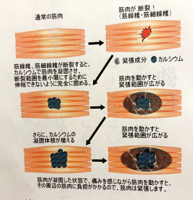 私自身の失敗談でもありますが、カルシウムで固まった筋肉をグイグイ揉みほぐすと、筋肉の繊維は小さな断裂を繰り返し(筋損傷)その結果、さらに多くのカルシウムを集めてしまい、塊がより大きく、より硬くなってしまうのです。